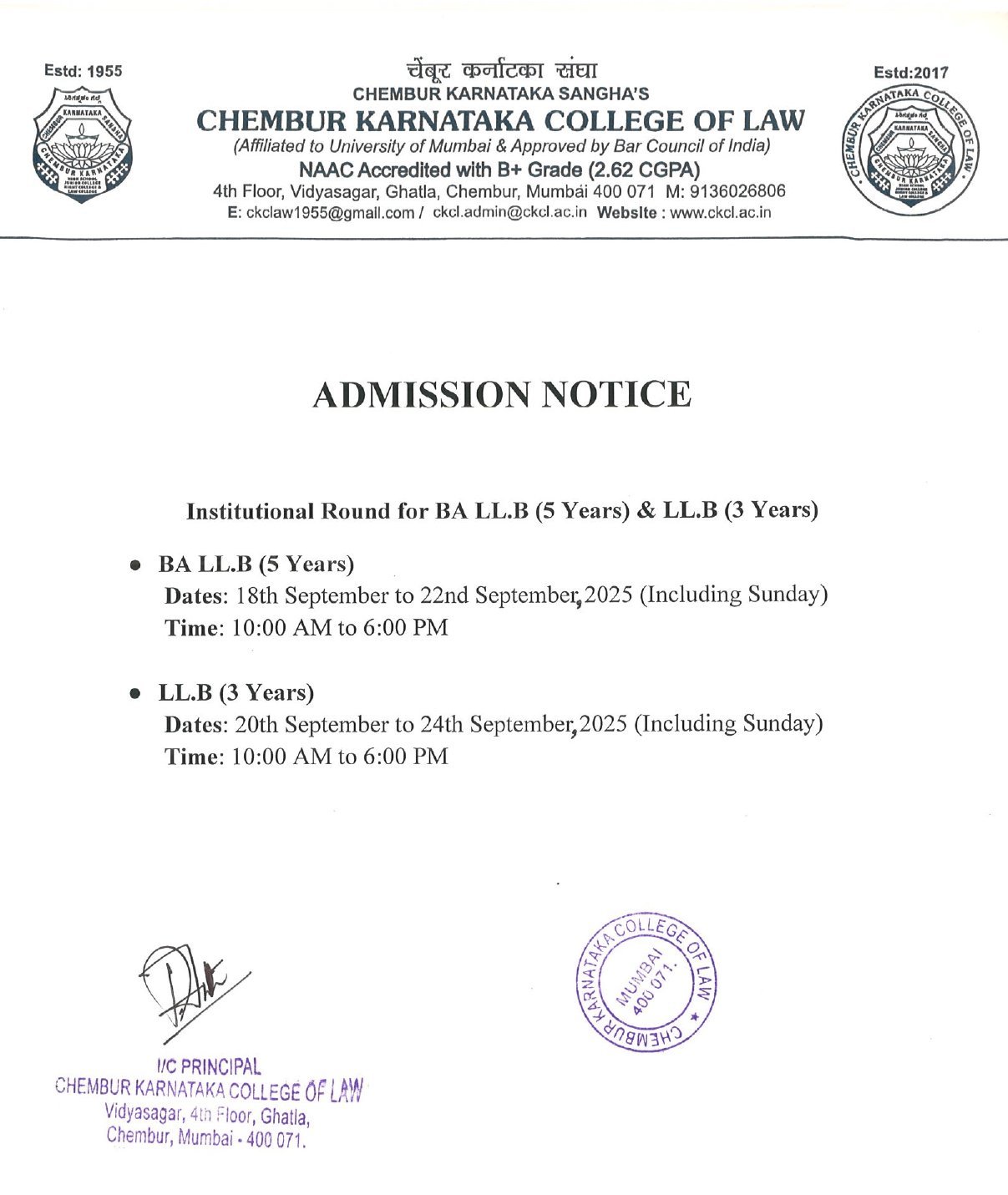 Chembur Karnataka College of Law aims to ensure the development of honest law professionals with integrity, diligence and national spirit. The application of the knowledge is not only limited to professional practice but also quintessential for administrative and corporate jobs. All this, while conserving the fundamentals of the college to deliver citizens and professionals that are aware, acknowledge and enlightened with the law cluster of the country.